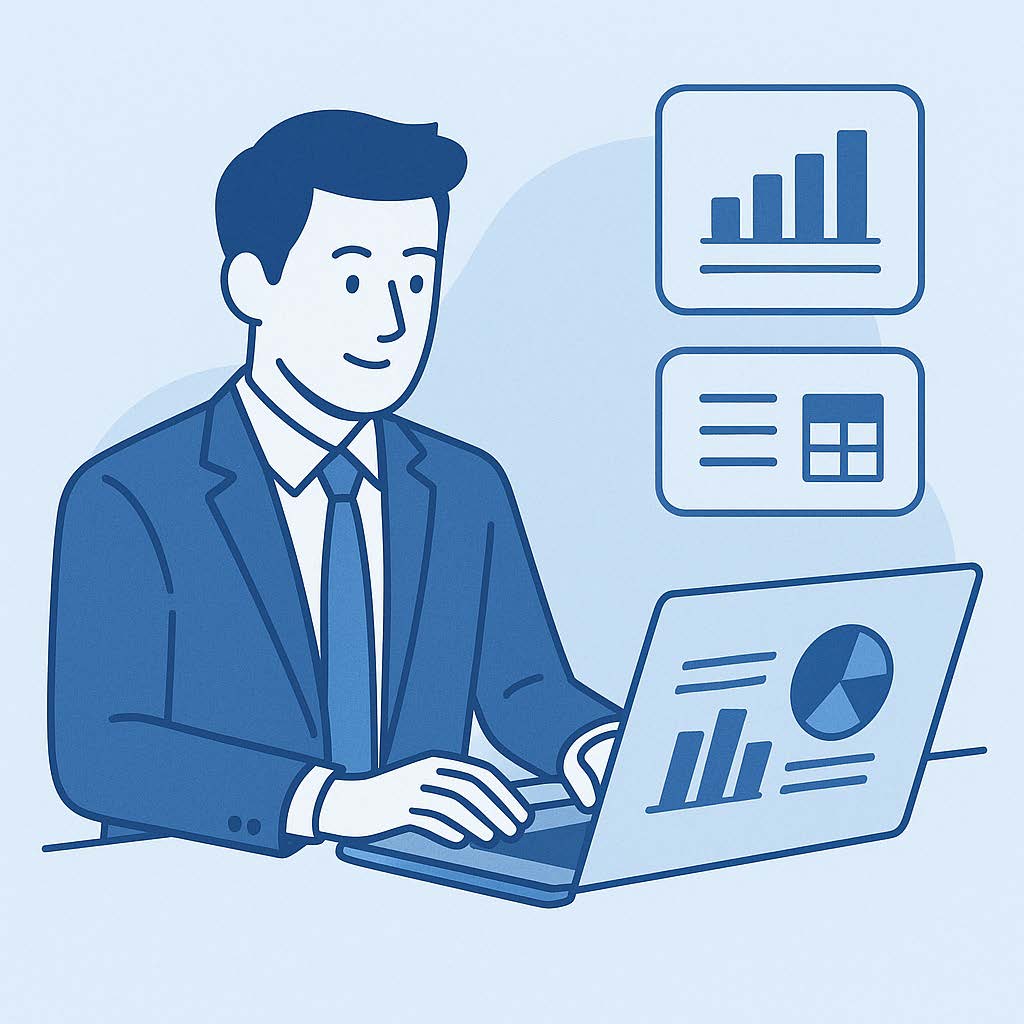 ビジネスマンがパソコンでデータ処理を行っているイラストを生成してください。リアルなタッチではなく、簡略化されたデザインで、全体的に青っぽい色味。
