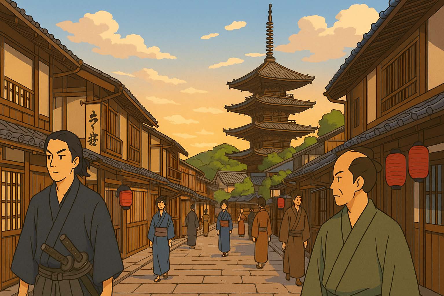 幕末の京都の町のイラストを生成して下さい。アニメチックなタッチで、アスペクト比は16:9