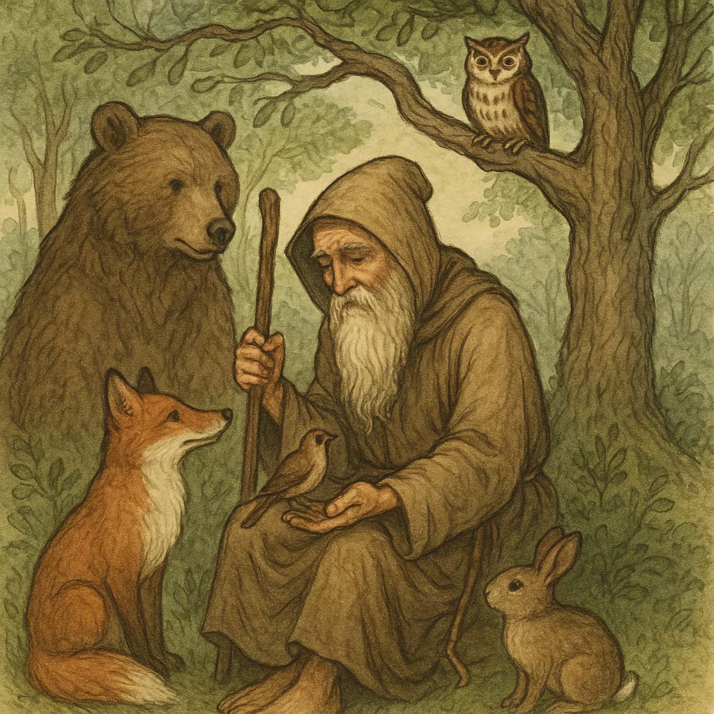 please draw an illustration of hermit and animals.