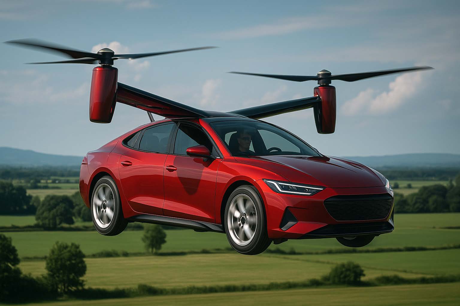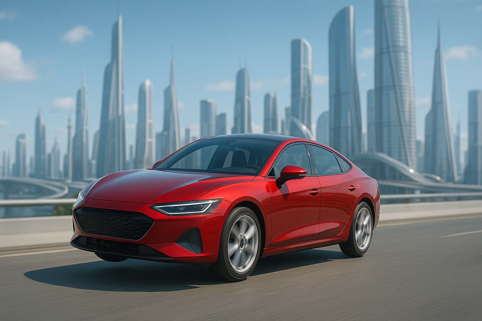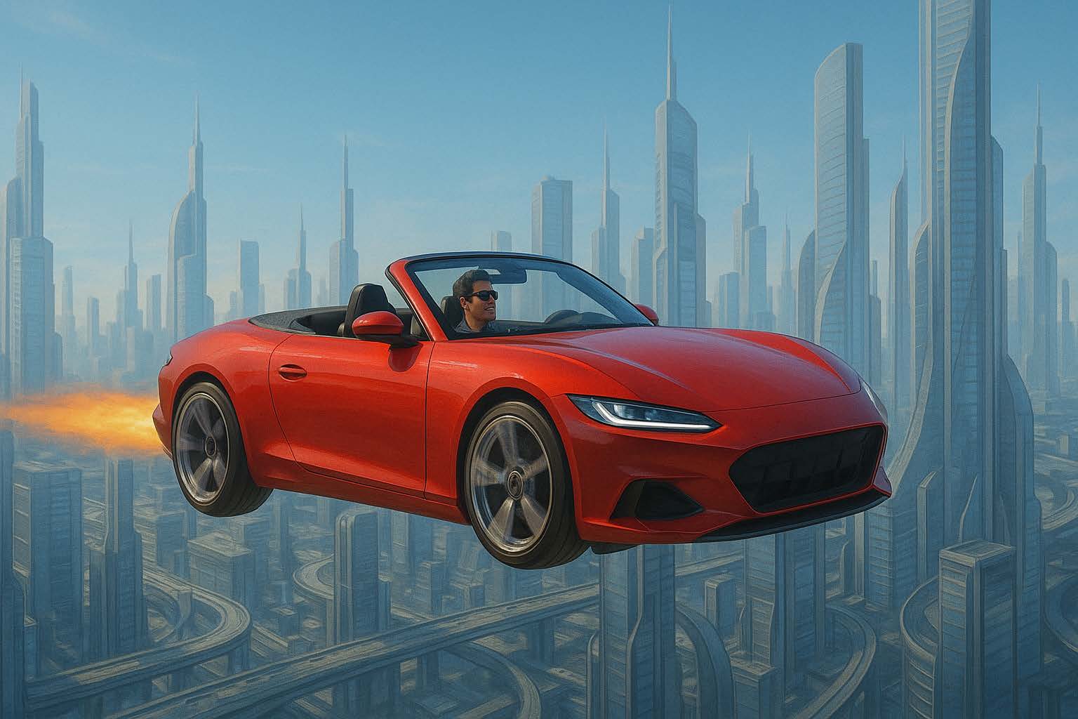 空飛ぶ車の画像を生成してください。写真のような画像、車の色は赤、SFイメージ