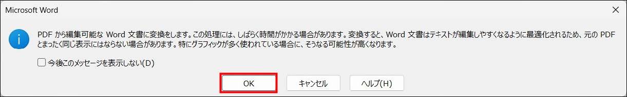 すると下図のようなウィンドウが表示されます。「OK」をクリックして変換は完了です。Word化されたファイルが開かれるので、自由に編集しましょう。