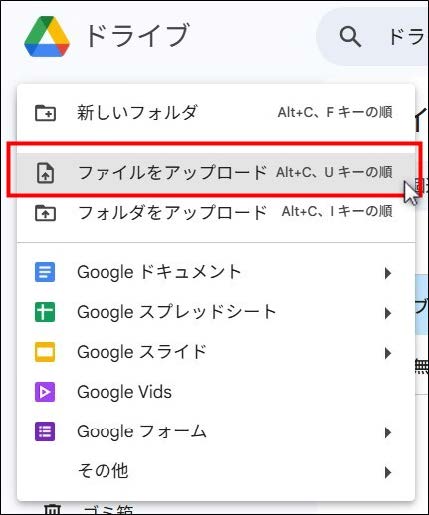 「新規」をクリックすると、下図のようなメニューが表示されるので、次に「ファイルをアップロード」をクリックしましょう。