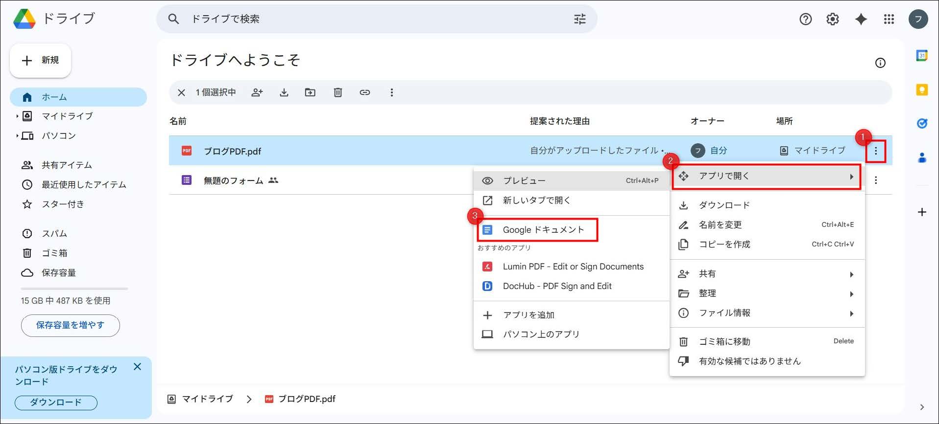 あとはアップロードしたファイルをGoogleドキュメント形式で開くだけです。開きたいPDFファイル右端の3点メニューをクリックし、表示されるメニューから「アプリで開く」→「Googleドキュメント」を選択しましょう。これでPDFだったものがGoogleドキュメントで開かれます。