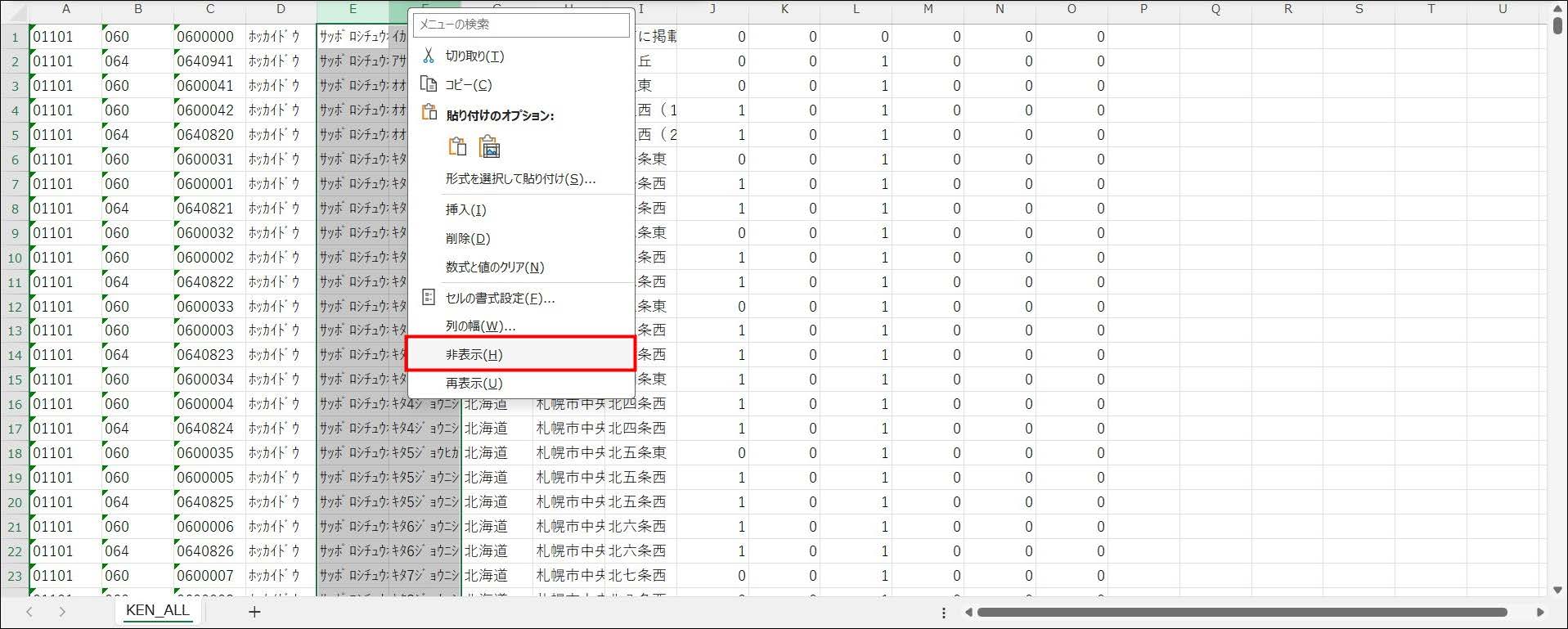 非表示にしたい行や列を選択し右クリックします。すると下図のようにメニューが表示されるので、そこから【非表示】を選択しましょう。