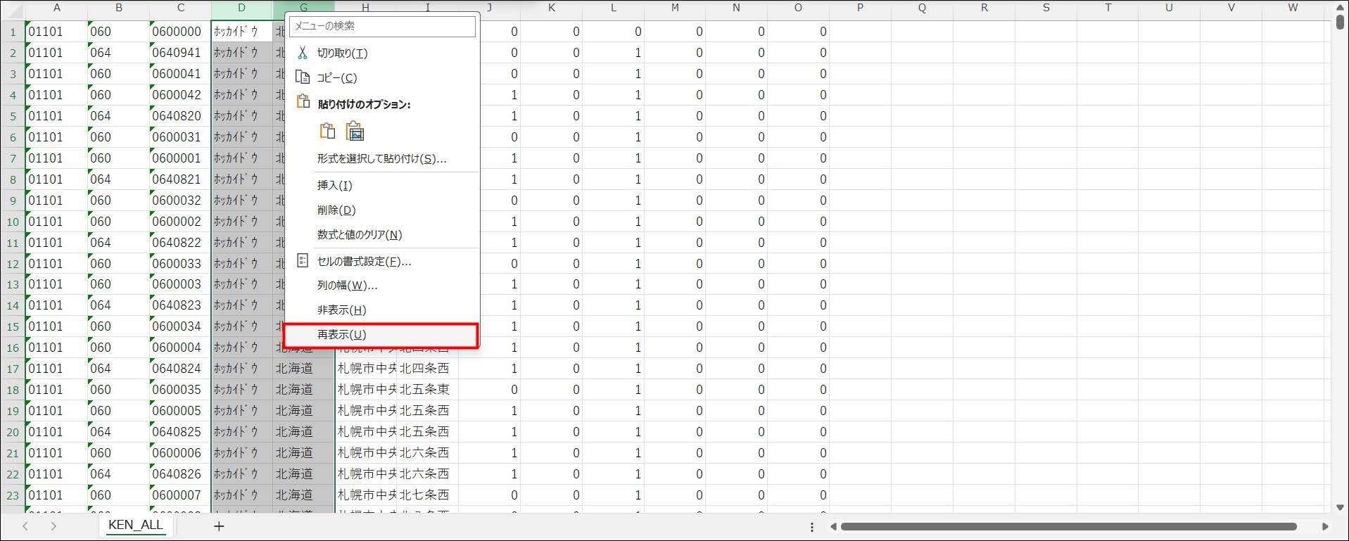 行や列を選択したらそのまま右クリックします。すると下図のようにメニューが表示されるので、そこから【再表示】を選択しましょう。これで解除は完了です。