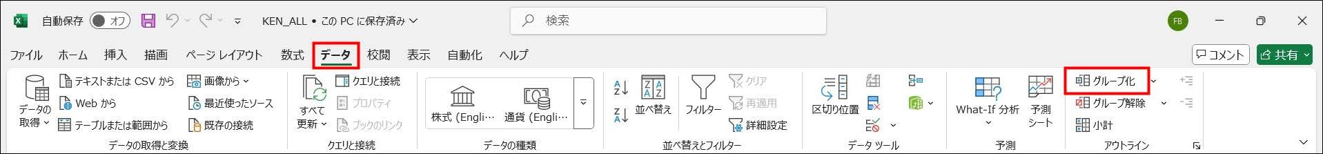 選択したら、【データ】タブの【グループ化】をクリックします。これでグループ化は完了です。