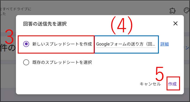 4.画面の青線で囲まれた部分からスプレッドシートの名前を設定し、「作成」をクリック。