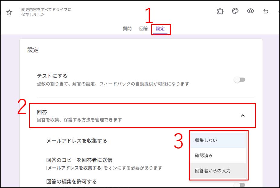 これは「設定」→「回答」→「メールアドレスを収集する」で設定することで、質問の項目に含めなくとも自動的にメールアドレスを収集してくれます。