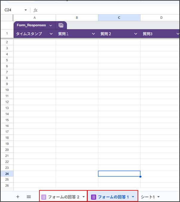 「フォームの回答1」にはフォームAの回答状況が、「フォームの回答2」にはフォームBの回答状況が反映されています。