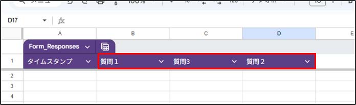質問を変更した際、以下のようにスプレッドシートへ反映されます。