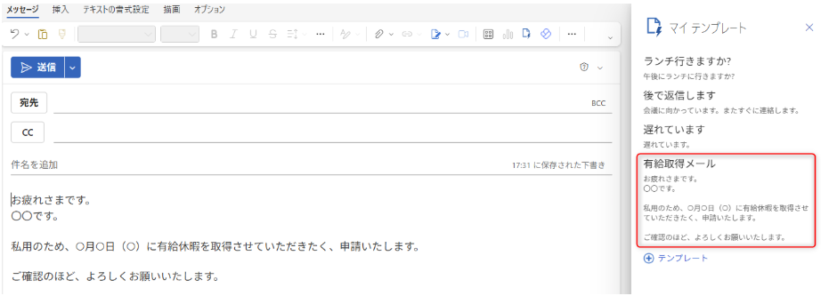 - 複数人宛や頻繁に相手が変わる場合は、宛先をテンプレートから外しておくのが安全。