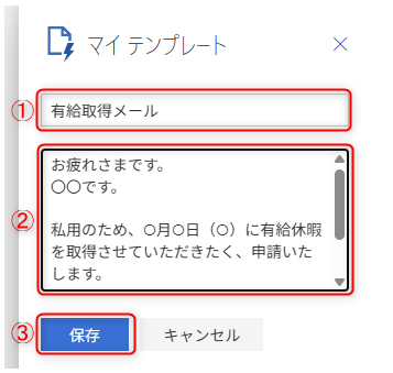4.①「テンプレート名」、②に挿入したいメール文を入力し、②「保存」をクリックします。