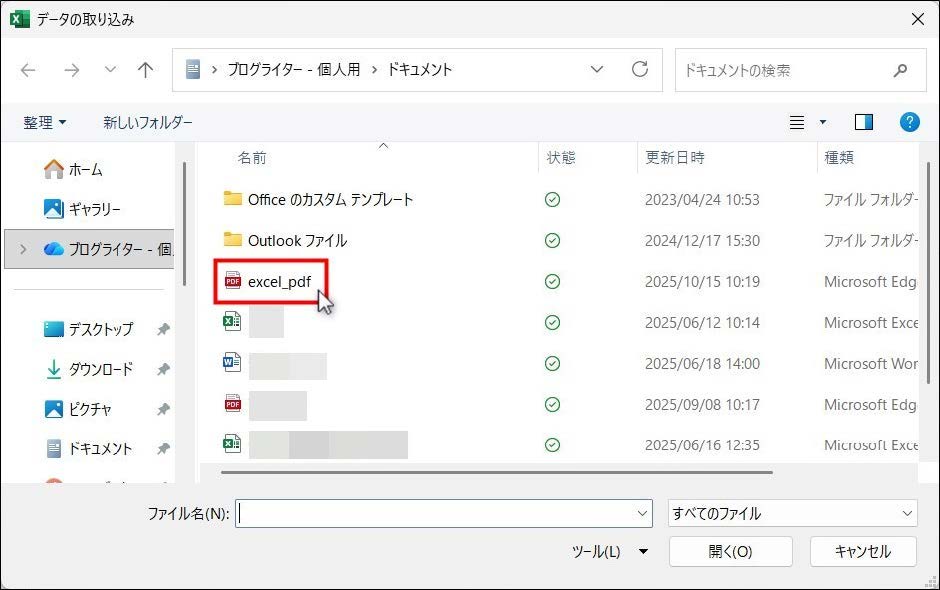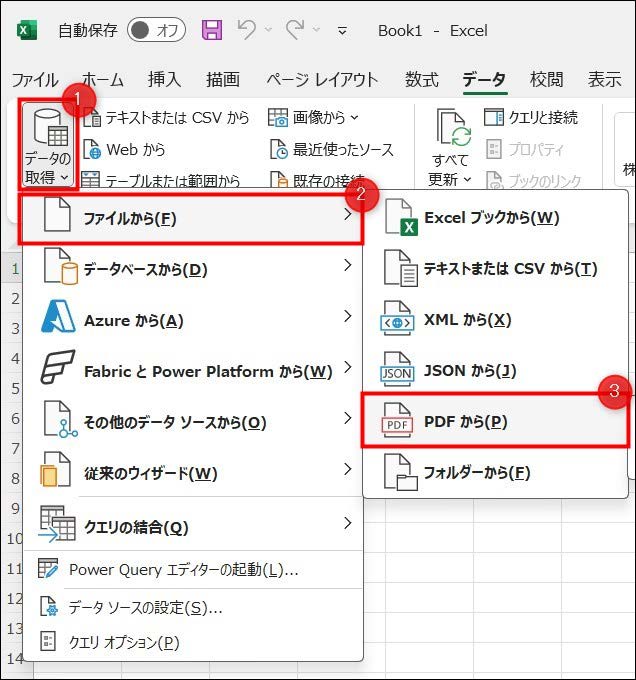 Excelの新規ファイルか新規シートを開き、【データ】タブの【データの取得】→【ファイルから】→【PDFから】をクリックします。
