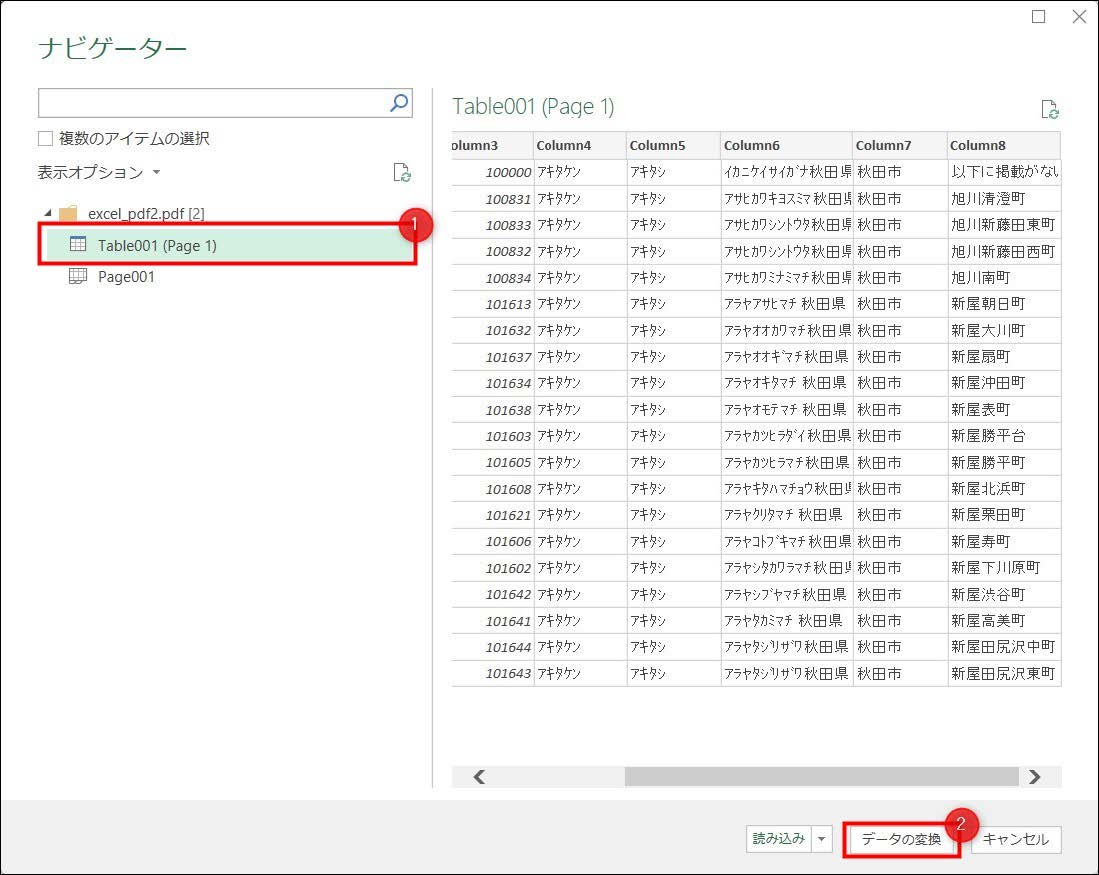 ファイルを選択出来たら、【データの変換】でPDFをExcelに変換します。