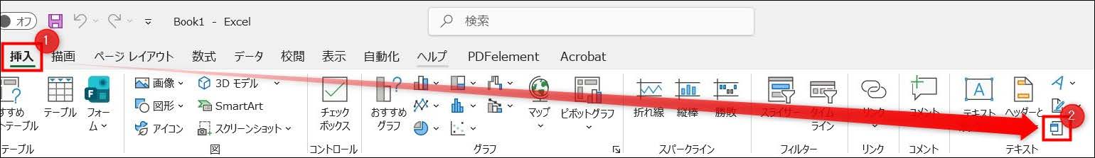 【オブジェクト】は小さくて分かりにくいですが、リボンの右側、テキストのグループにあります。