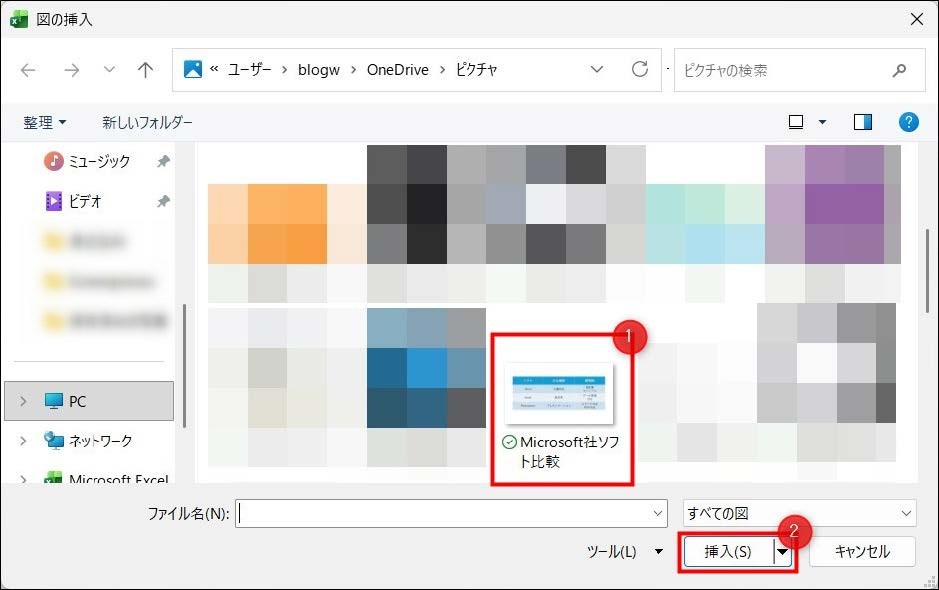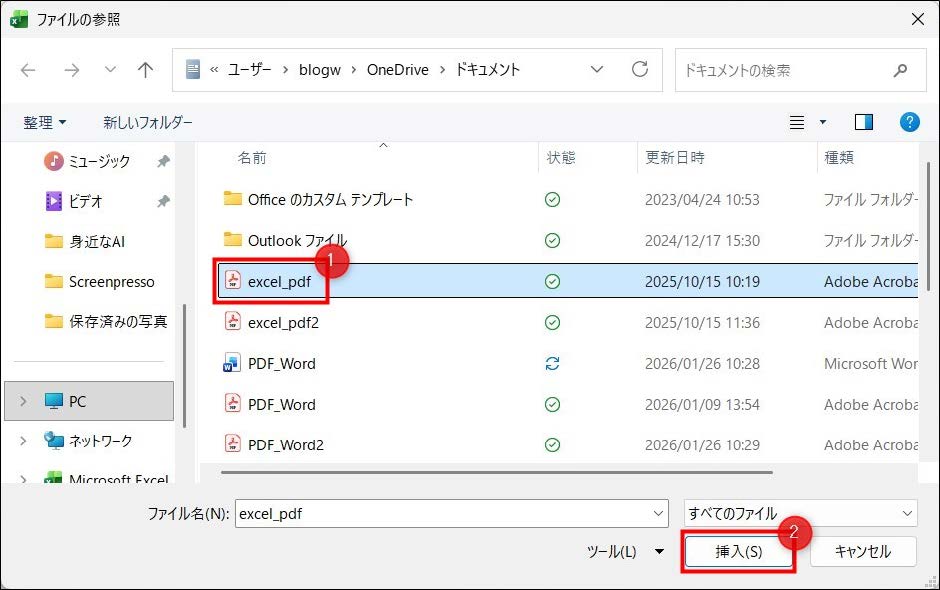 任意のファイルが選べるようになるので、貼り付けたいPDFを選択して、【挿入】をクリックします。