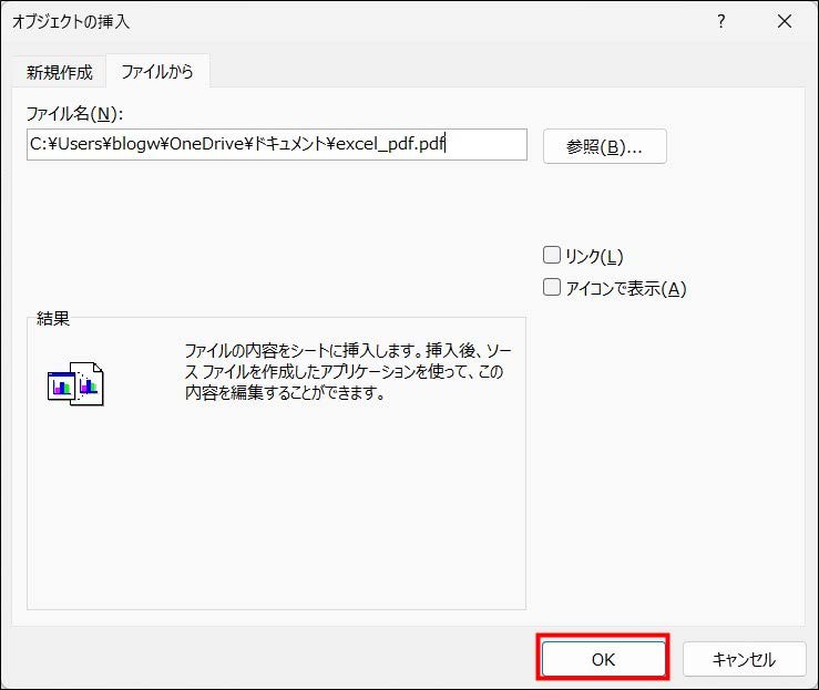 「リンク」や「アイコンで表示」は選択必須ではありませんが、「アイコンで表示」にチェックを入れると、このようにアイコンで貼り付けられるため、コンパクトで便利です。