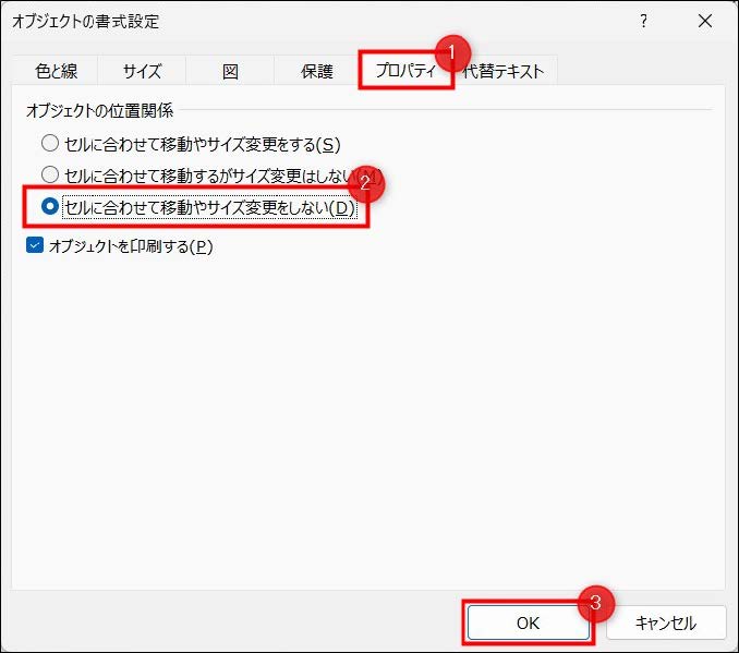 すると下図のようなウィンドウが表示されるので、【プロパティ】→【セルに合わせて移動やサイズ変更をしない】→【OK】をクリックします。これで設定は完了です。